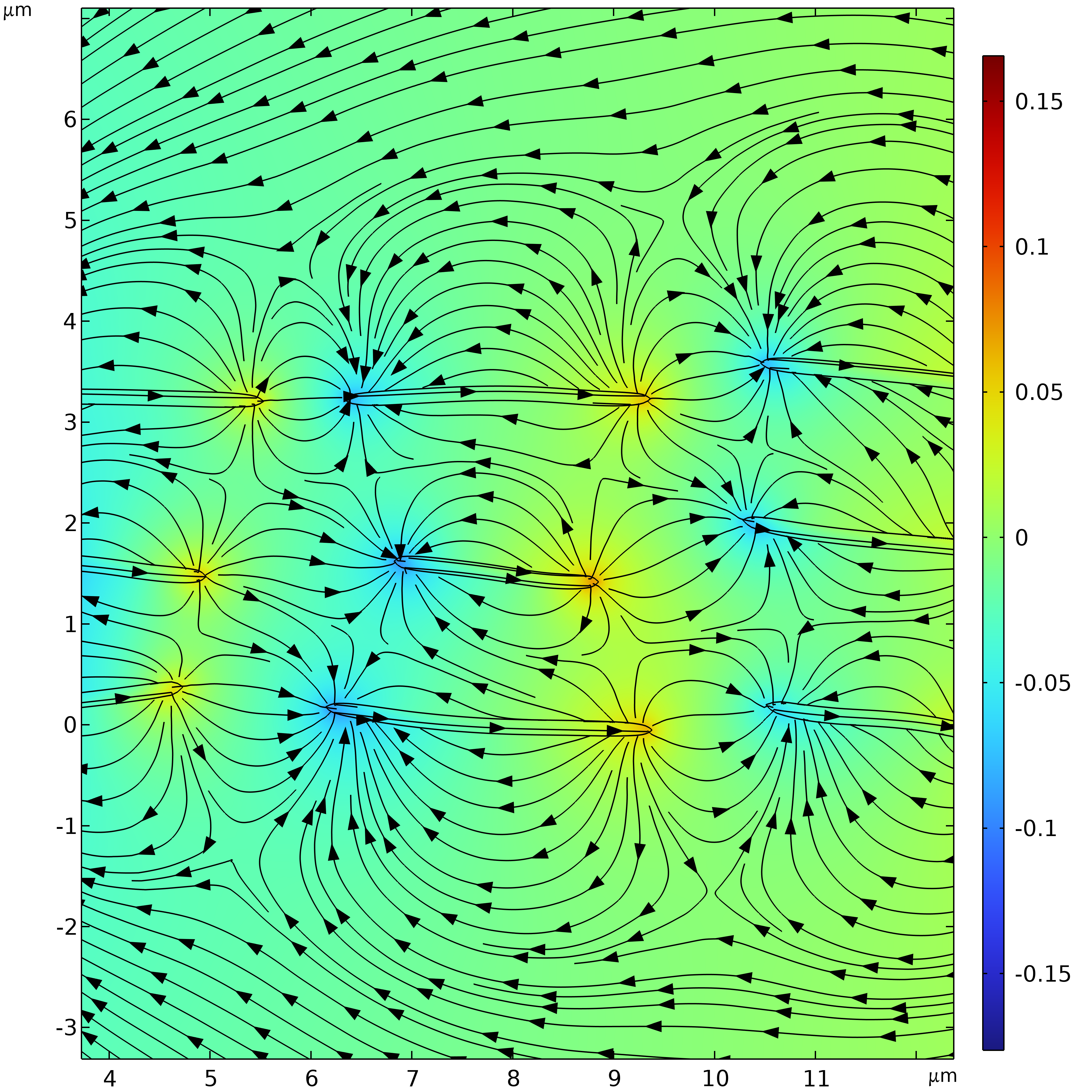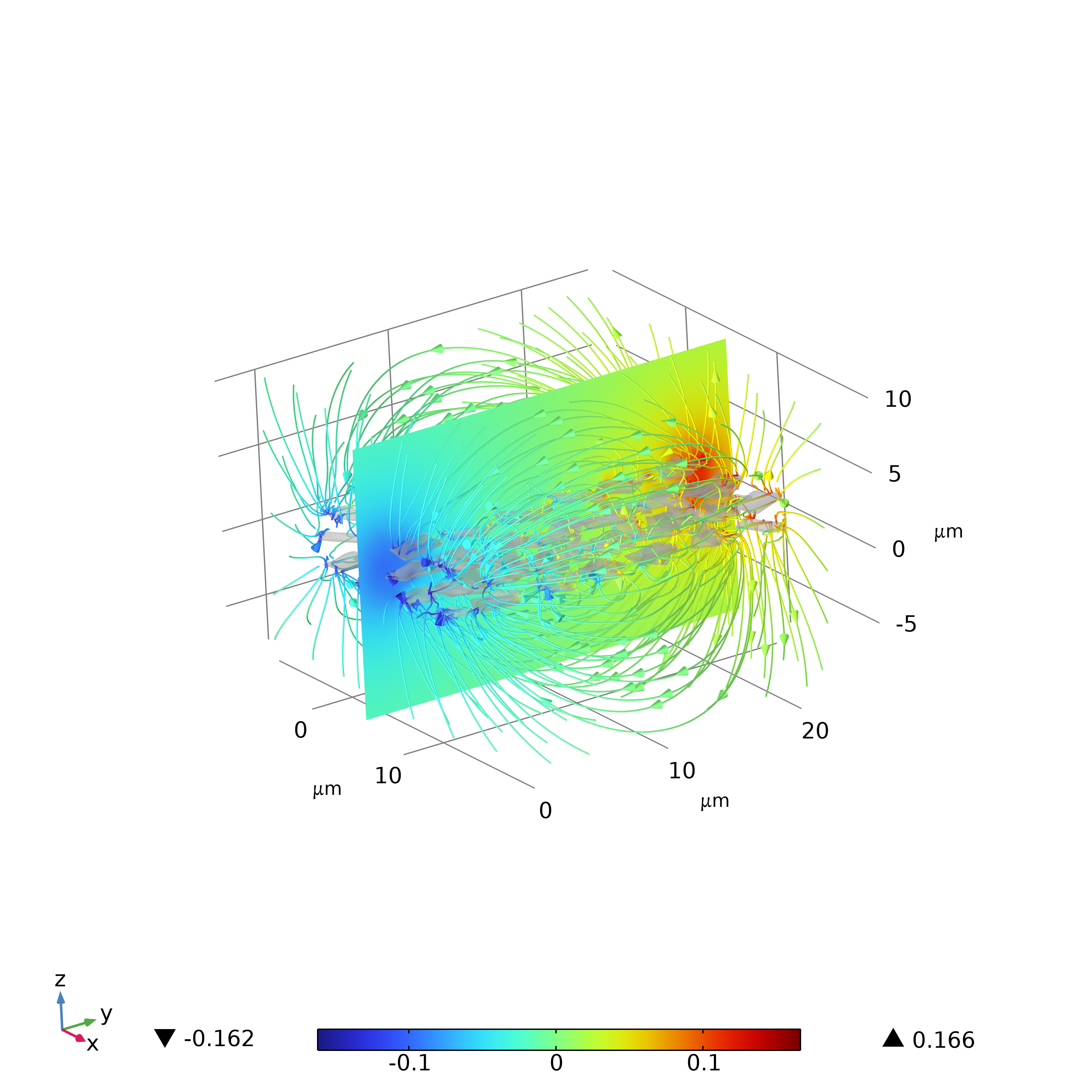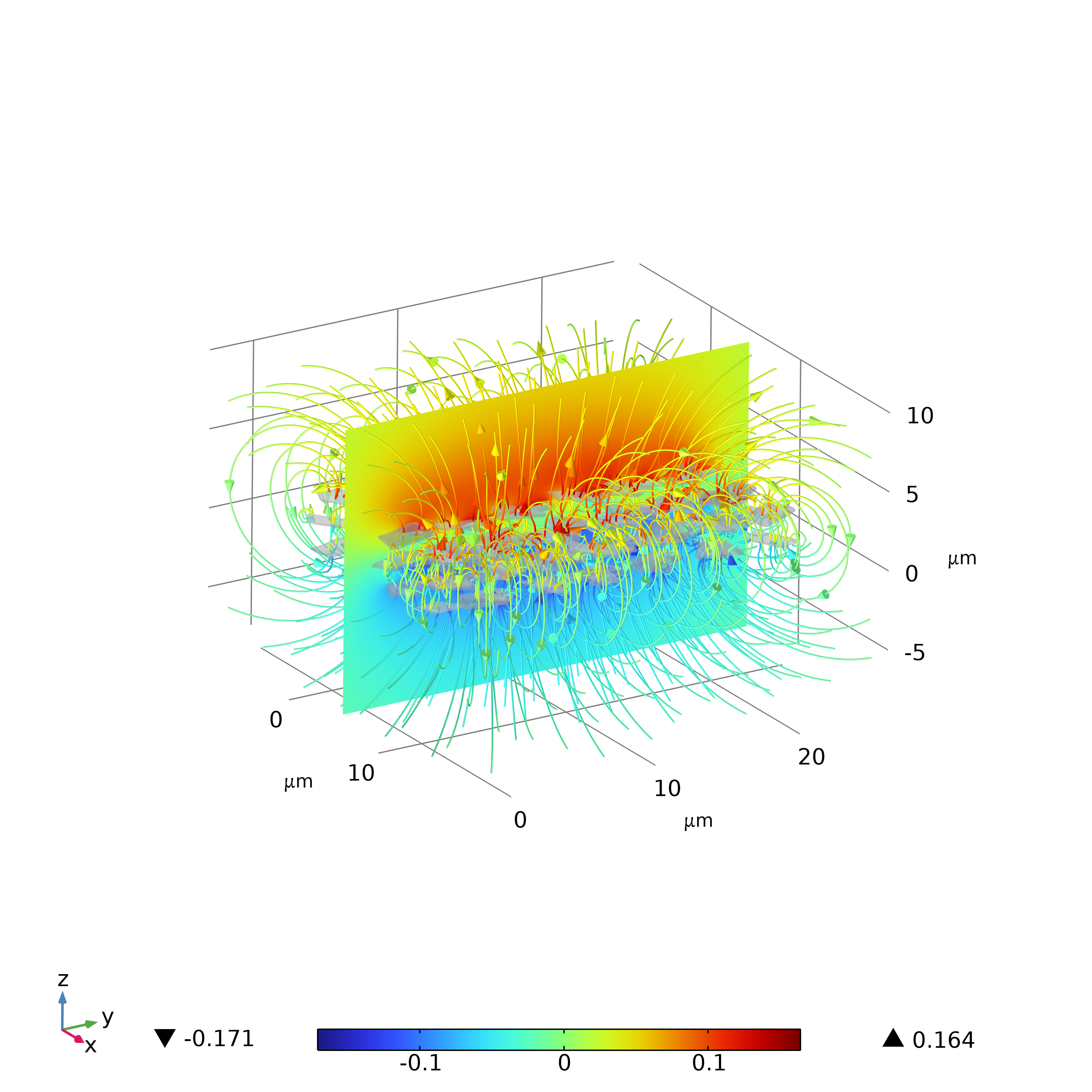 在微观下,溶液在微流管道中的流动会受到磁场的影响,镍钴制备的纳米片在外部强磁磁化后会留有剩磁。剩磁会持续影响微观下液体离子输运行为。本案例通过有限元仿真,通过预设剩磁分布(分别为x和y方向),对体系内的无电流磁场进行仿真。